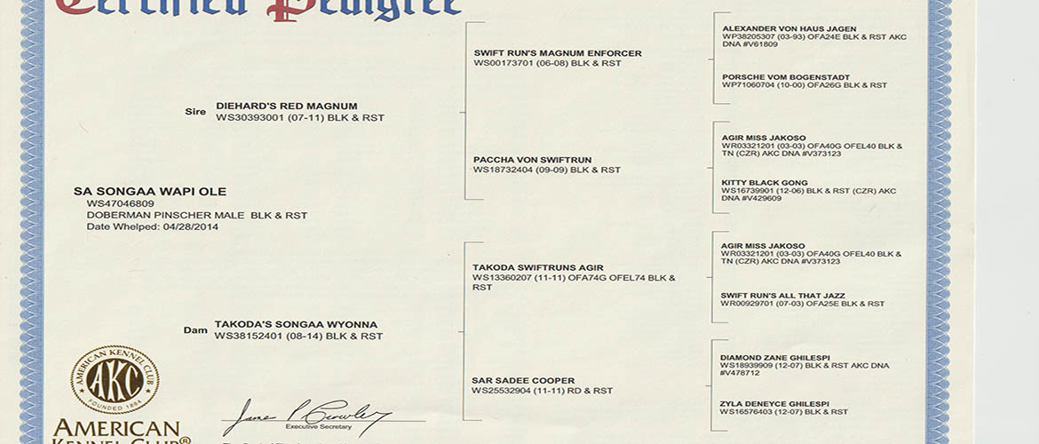 In addition, Star's great, great grandfather is the foundation Doberman of Swift Run, Alexander von Haus Jagen Sch3, FH, IPO3, ZTPSG1A, AD, WAC, CGC, who has produced the most Schutzhund titled Dobermans in the US. Alex's father was the renowned Doberman Arras Vom Wehebach Sch3 FH, Angek, KL-1, ZTP V1-A, Bdsg-Vize-Sieger, HD -1, who you can see in action here.
